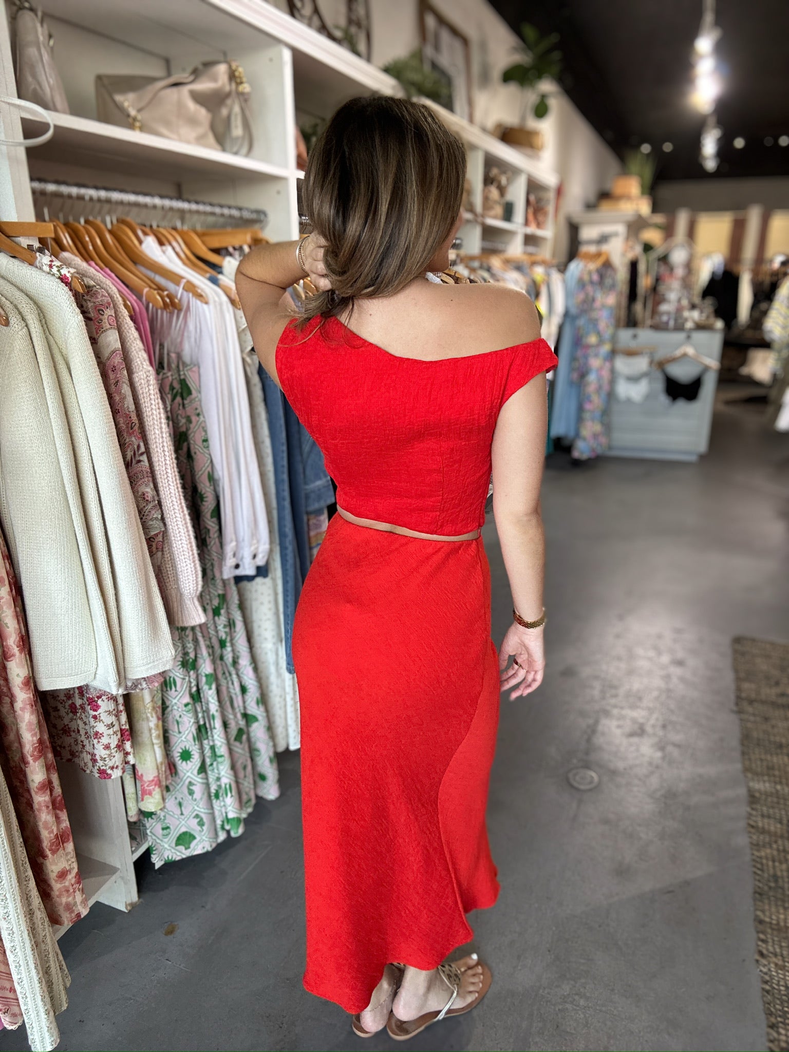 Make a statement in this stunning MINKPINK coordinating set. The asymmetrical top pairs perfectly with a rich red midi skirt, creating an effortlessly chic silhouette that turns heads. Fully lined for comfort and confidence, this showstopper combination is ideal for nights out, special occasions, or whenever you want to feel bold and fabulous. The thoughtful design details and quality construction ensure you'll reach for this set again and again.